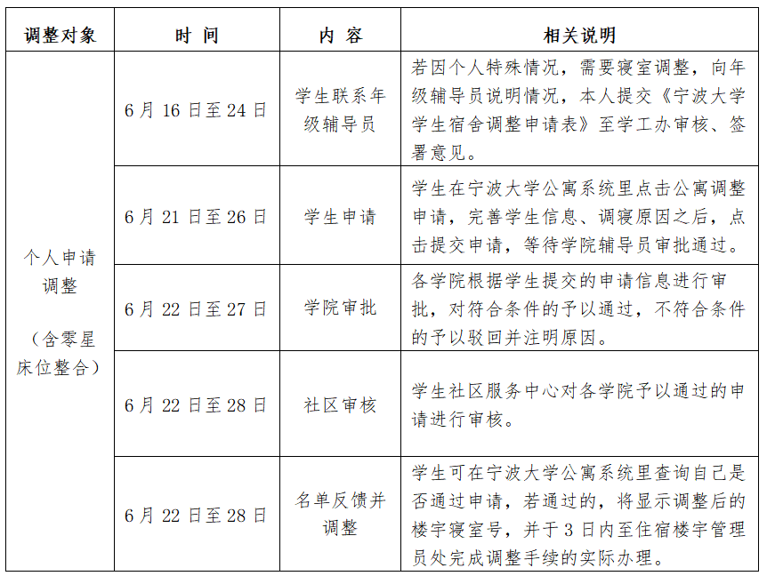 学生宿舍管理办法》(宁大政字〔2007〕104号)和《学生社区宿舍调配、调整管理办法》,为使寝室管理规范化、常态化,现将本学年末寝室调整相关安排通知如下:
