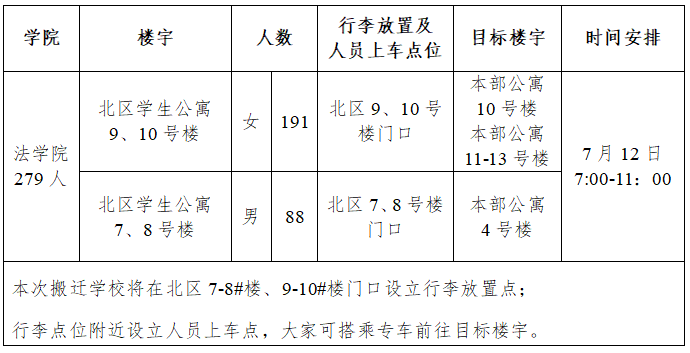 1.请大家提前一天打包好行李,并于搬迁当日(7月12日)按计划准时将行李搬运至点位指定位置上(见现场标识)。但需注意贵重物品(各类证件证书、电脑等数码产品)、伤害物品(如哑铃、臂力器等铁制物品、玻璃制品)等一律自行搬运,以免在搬运期间出现遗漏、丢失、破损或伤害搬运人员的情况。