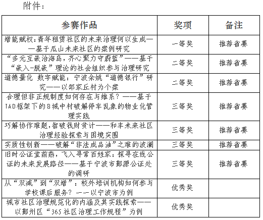 为迎接党的二十大胜利召开,引导大学生关注和践行浙江省高质量发展建设共同富裕示范区的实践探索,进一步提高大学生运用公共管理理论和公共政策分析方法解决实际问题的能力,促进公共管理相关专业人才培养,搭建交流平台,选拔优秀作品参加浙江省第六届大学生公共管理案例大赛,按照书面文本评审和现场答辩综合成绩,评选出一等奖1项、二等奖2项、三等奖4项、优秀奖2项,并推荐7支团队进入省赛。具体名单详见附件。