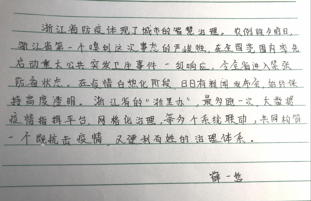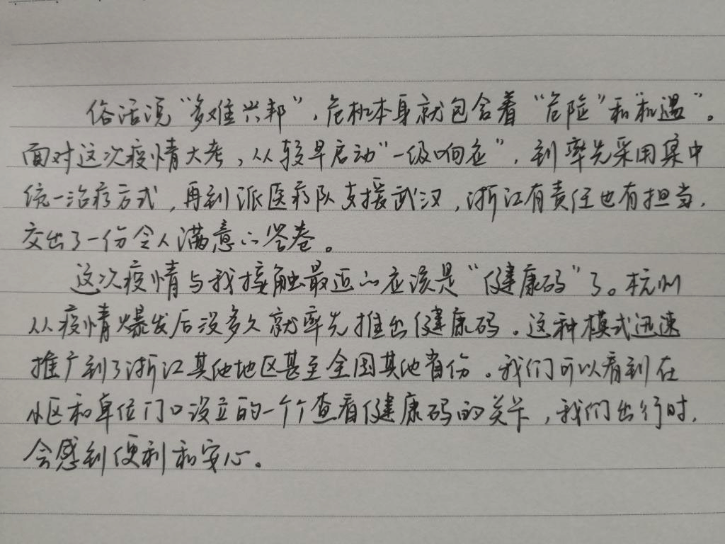其中薛一哲同学畅谈了自己的感受,对浙江省的防疫能力深感敬佩,并向同学分享了她的手写感想。