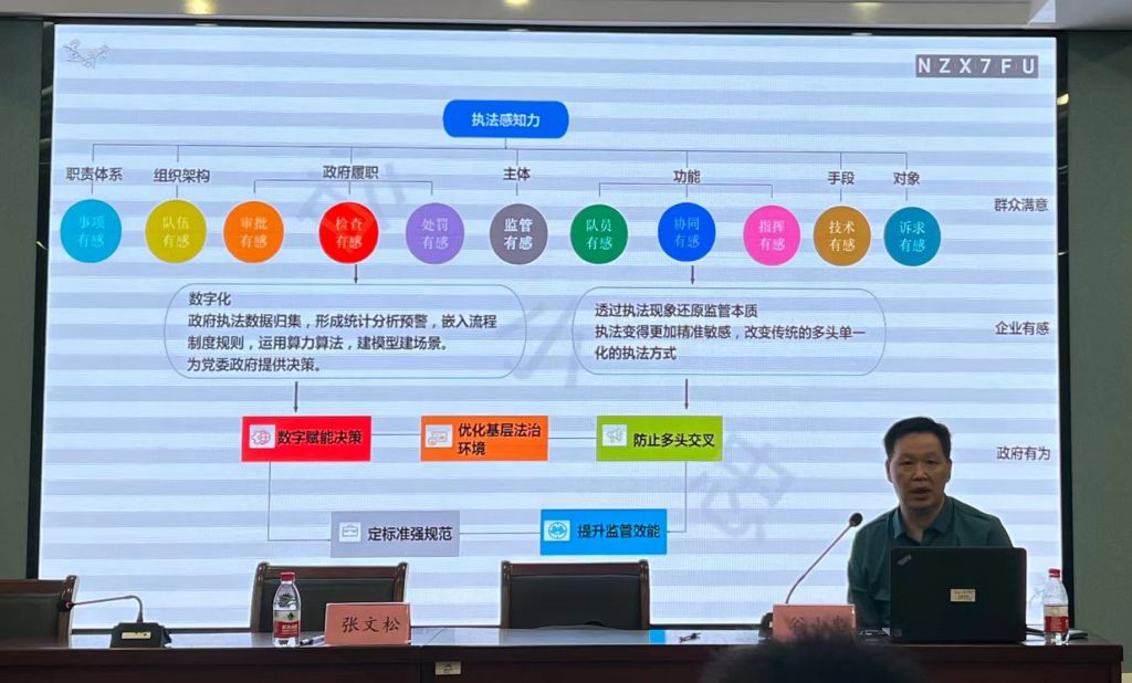 接着,谷主任从县域改革逻辑、权责统一职责逻辑、“金字塔”型队伍系统、数字智治执法逻辑、权威高效制度系统、一支队伍管执法逻辑、多层多维评价体系、执法撬动立法、司法和守法这八个维度与同学们深入探讨大综合一体化执法体系的目标任务。以“重构、重整、重塑、重建”为逻辑,推进县域“大综合一体化”行政执法改革,动态管理和完善权责统一职责逻辑,推动监管和执法融合,形成更大力度、更大范围、应统尽统的“金字塔”型队伍系统,同时发挥“大综合一体化”执法监管数字应用的功能,加快促进权威高效制度系统的完善。