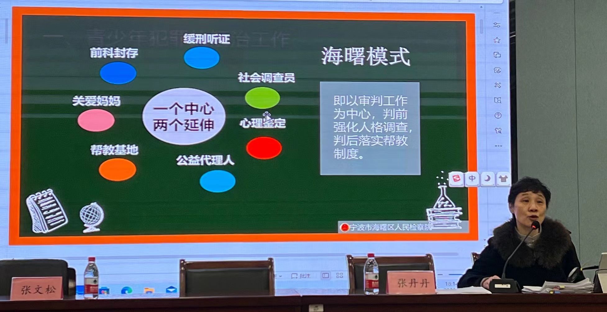 讲座伊始,张副检察长为同学们介绍了国外对未成年人触犯法律的处置情况:美国、日本等国家通常采用非刑罚方法,如寄宿家庭、参加劳动课程等,这有助于帮助未成年犯回归社会。日本在全国设置了50多所心理鉴别所,对所有犯错的孩子进行社会调查以及心理鉴定,并根据不同情况区别对待。立足于我国未成年人犯罪情况,同时借鉴上述国外法院在少年审判中的实践,宁波市海曙区人民法院对未成年人触犯法律实行“一个中心,两个延伸”的海曙模式,即以审判工作为中心,判前强化人格调查,判后落实帮教制度。