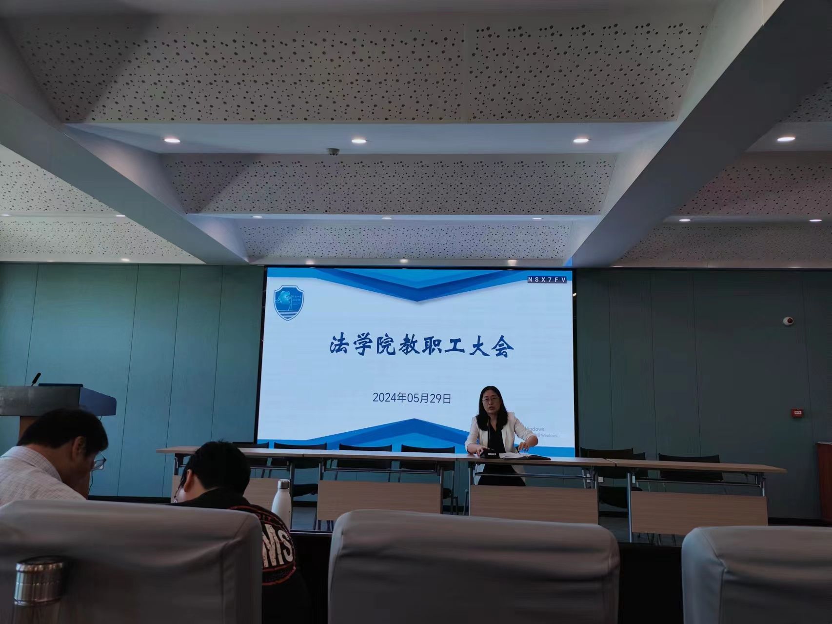 院长梁开银、党委书记孙芬娜、学院班子成员及全体教职工出席会议,会议由孙芬娜书记主持。