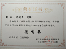 此次大会对青年学子论文进行了评审和颁奖。2022级本科生李荟《绿色税收区域差异化的完善路径及其法制保障》获二等奖,2022级本科生杨筱伟《新形势下纳税人权利保障的法治状况与优化路径研究》获三等奖,2022级本科生黄潇丹《住房市场分化下专项附加扣除政策的优化路径》和2024级本科生靳灿、冯婷玉《我国纳税人权利保障问题研究》获优秀奖。