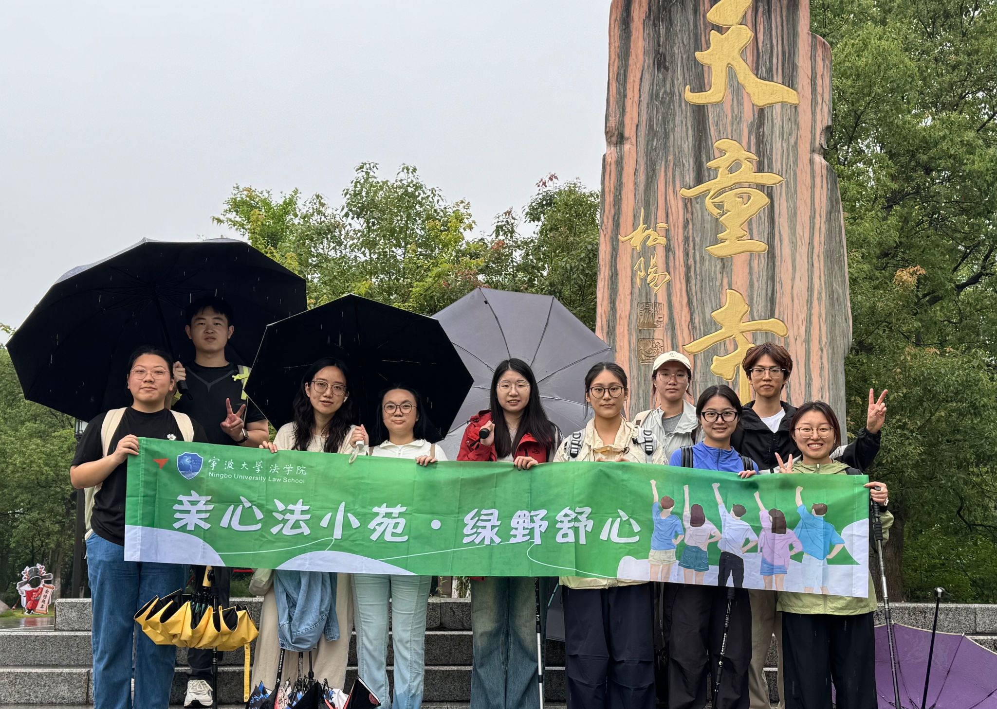 下午13:00,在领队胡逸凡同学的带领下,10名同学开始了全长7.9公里、爬升230米的天童寺小环线徒步。尽管天公不作美,细雨绵绵,但同学们的热情丝毫未减。雨中徒步别有一番意境:古寺红墙更显庄重,石阶青苔愈发生动,雨打竹林奏响自然乐章。