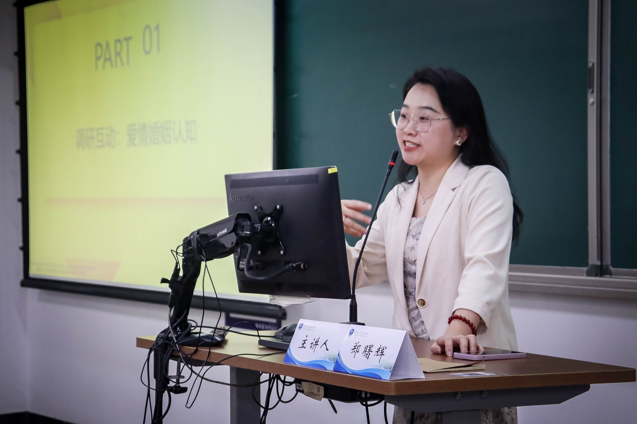 讲座伊始,郑曙辉律师通过轻松有趣的互动拉近了与同学们的距离,自然地引出了爱情与婚姻中的法律议题这一核心话题。接着,主讲人从社会情感属性和法律契约关系的双重视角,深入解读了爱情与婚姻的本质,阐明二者并非对立而是相互补充的关系。