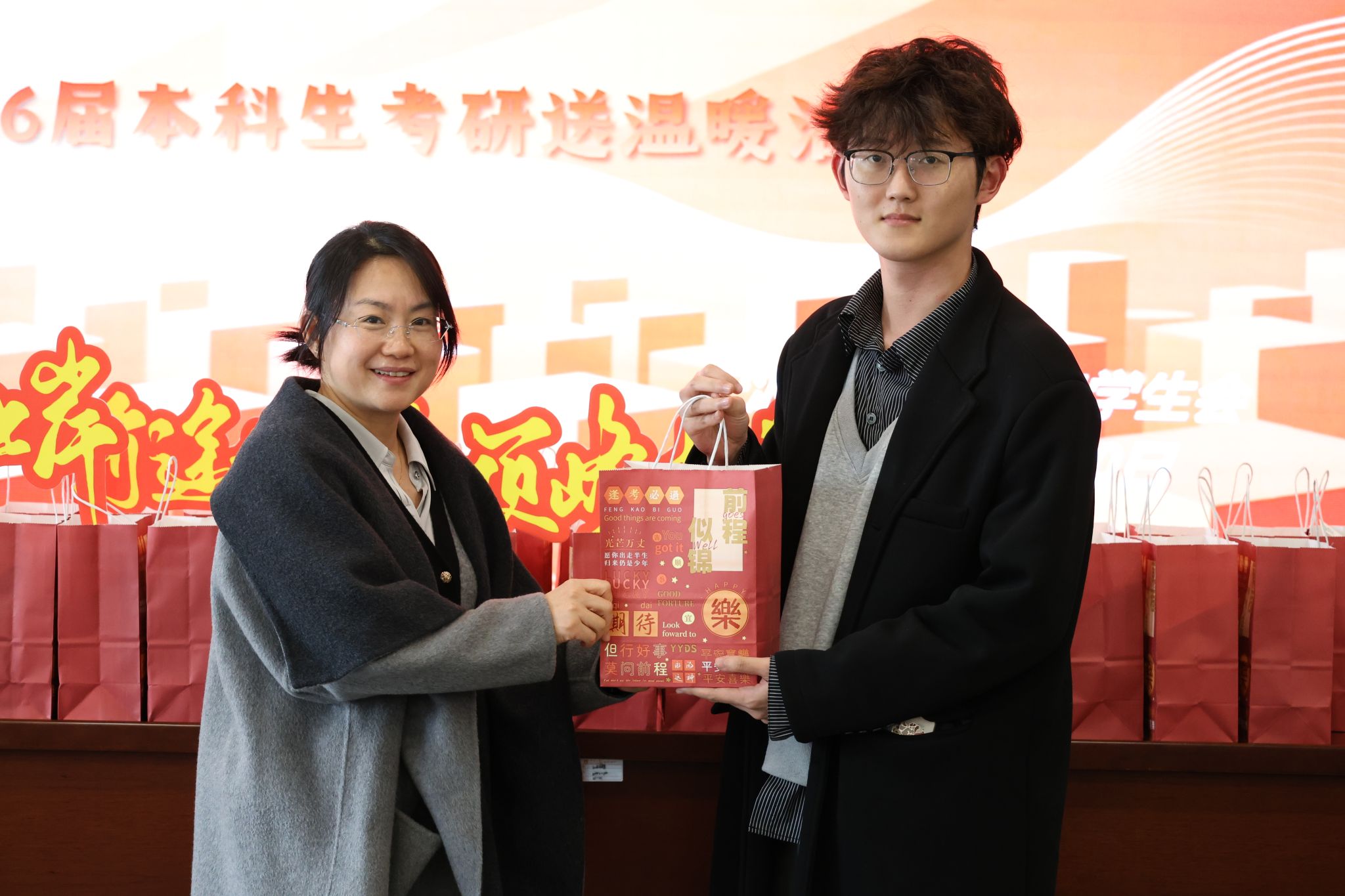 党委副书记谢果凰和学工办全体老师亲手发放考研大礼包,向考研学子送上诚挚祝福,叮嘱大家注意考前作息与保暖,与考研学子拍照留念,为他们注入备考信心。