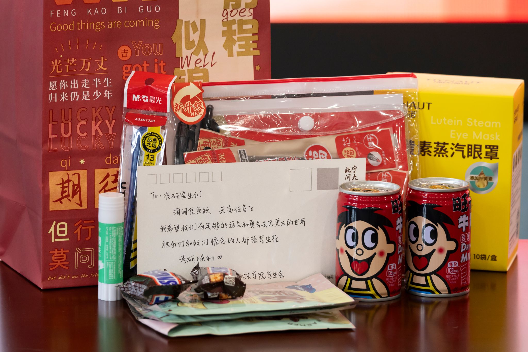 今年的考研大礼包在心意与实用性上再升级,更加贴合学子们的备考需求。不仅保留了备受好评的考研文具大礼包、暖宝宝、旺仔牛奶等物品,还特别加入了蒸汽眼罩,缓解备考疲劳。这份满载心意的礼包,也寄托着“脚踏实地,行稳致远”的期许,愿考研学子在备考征程中步步为营,顺利上岸!