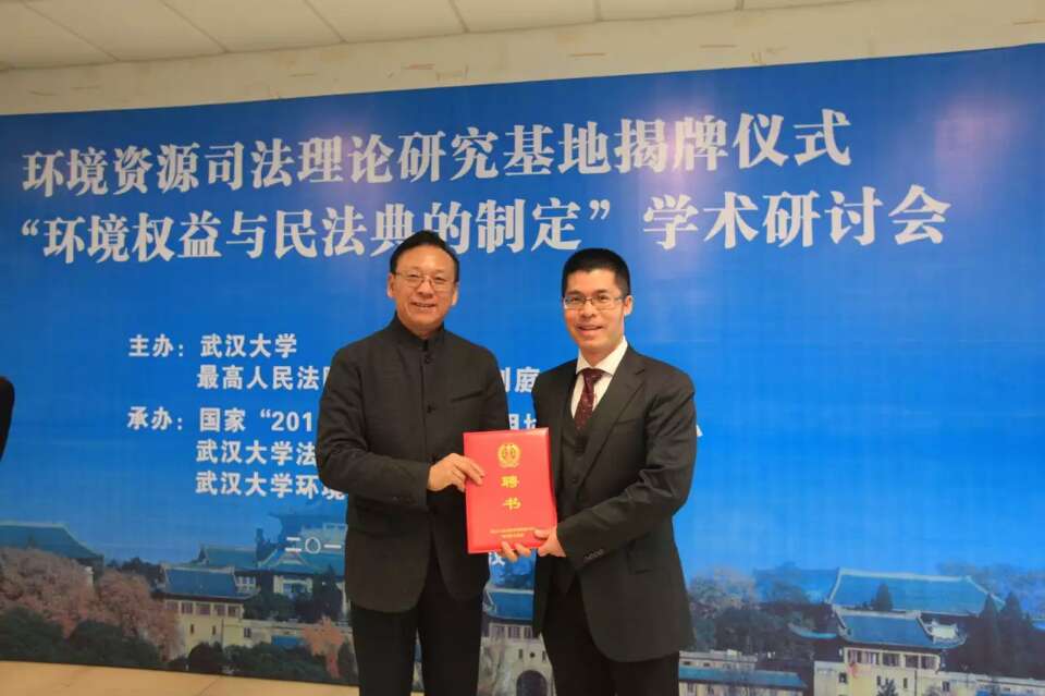 钭晓东教授受邀参会并受聘为最高院环境司法研究基地研究员。江必新副院长为其颁发聘书。钭晓东教授表示,接过聘书,深感其中的信任、责任与使命!一定努力。正如江必新副院长在致辞中指出的:加倍努力、有所作为,与污染环境、破坏生态行为斗争,保障环境权益,共建、共享生态文明人间福地!让环境法治行动真正立地!