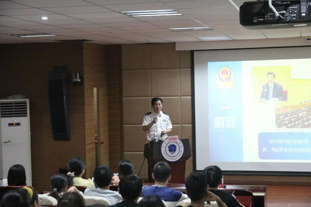 讲座开始前,陆区长向李学兰书记和学生代表赠送了宁波市公安局鄞州分局汇编的调解读本《警调三十六计》,讲座在热烈的气氛中拉开序幕。陆区长首先介绍了自己的求学经历和本次讲座的主题:“实务”即“实际操作问题”,主要是让同学们更加深入地了解现在公安机关的工作情况。在“对党忠诚,服务人民,执法公正,纪律严明”的训言指导下,人民警察队伍在新时代下被赋予了更加光荣且艰巨的任务。此后陆区长介绍了人民警察的警旗、警徽和警歌;也欣喜地介绍了中国人民警察节的设立——第一个中国人民警察节将在2021年1月10日到来,国家设立这一节日,深刻体现了国家对人民警察队伍的关怀和重视。