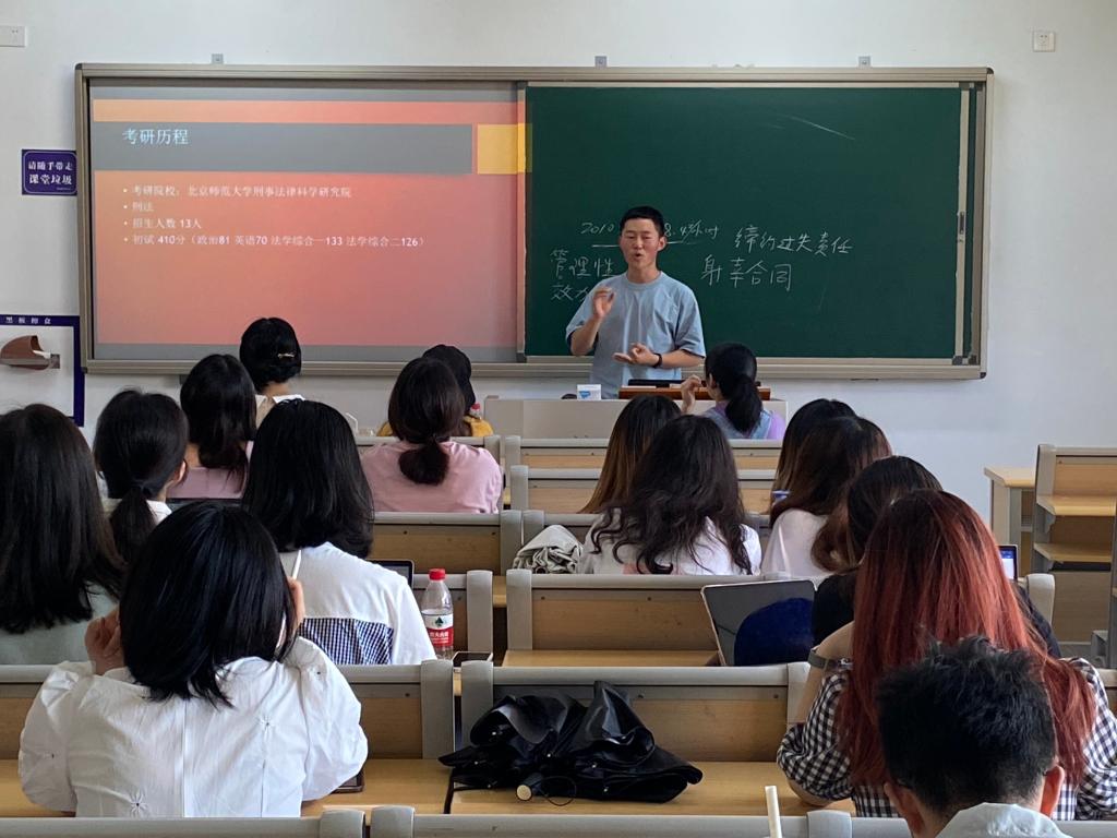此次交流会邀请了考研拟录取为北京师范大学的张印、上海财经大学的武泽霖、西南政法大学的饶博涵、华东政法大学的楼昳涵、汤阳盼5位2017级本科生参与分享。5位同学结合自身的考研经历,从报考学校的确定、复习资料、复习方法、复习进度的选择、备考心态调整等方面详细地向在场同学们传授了自己的经验,并一一回答了参会同学的提问。