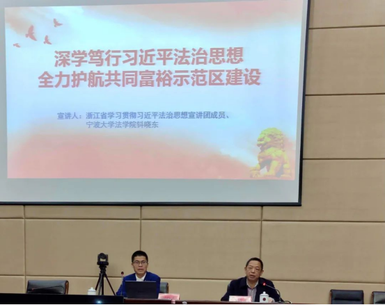 钭晓东教授从坚定不移传承中国特色社会主义法治红色基因、牢牢把握习近平法治思想的核心要义、关于学习宣传贯彻习近平法治思想的决策部署、努力为高质量发展建设共同富裕示范区提供法治保障等四方面,阐述了习近平法治思想的发展历史、核心要义、内容要求和具体实践,并指出要通过深学笃行习近平法治思想,全力护航共同富裕示范区建设。