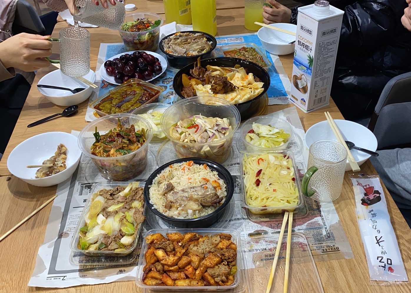 吃零食、玩游戏、看电影,校友之家欢声笑语,年味甚浓。考虑到新疆籍同学的饮食差异,晚餐学院特地联系了新疆菜餐厅准备了地道的当地美食,大家共同提前享用了年夜饭。