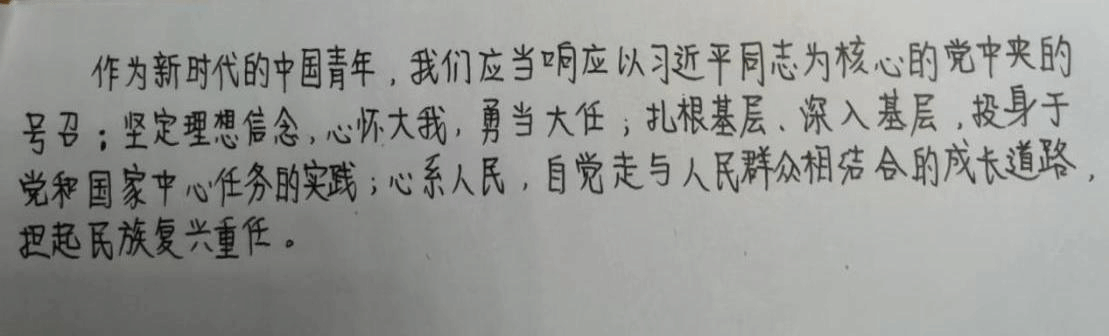 法学203团支部同学统一在线上学习了总书记在人民大学的讲话,通过书写的方式表达自己的理解与感慨。沈千红和汤伊雯同学在学习相关精神后表示,要牢记总书记的殷殷嘱托,传承红色基因,扎根中国大地;向英雄学习,向前辈学习,向榜样学习,争做堪当民族复兴重任的时代新人。