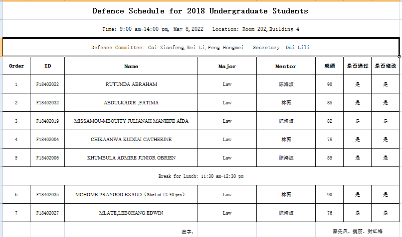 陈海波老师在4号教学楼204教室主持了2018级本科留学生毕业论文第二轮答辩。2018级两名本科留学生Chibwe Chitakwa和Tanyaradzwa Lovemore Goredema参加,并通过了本次答辩。