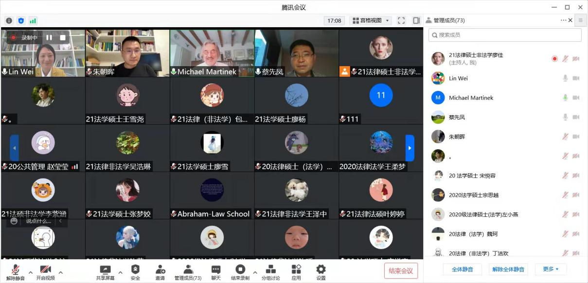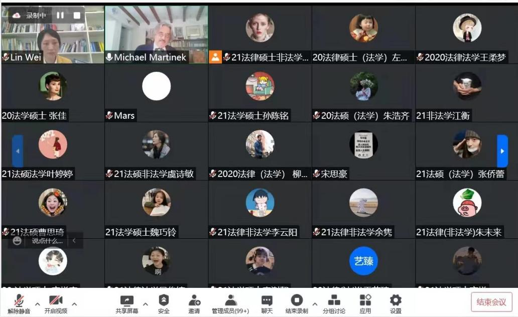 有170余名师生在线参与。马丁内克教授从比较法的定义出发,分析了比较法和国际私法的关系,介绍了比较法学的产生和发展以及比较法学在不同时期的任务,探讨了比较法学的研究方法,总结了比较法学的目标,即要深入研究不同法律体系的特色和共性,为促进法律的协调寻找答案。讲座最后,马丁内克教授就学生提出的比较法相关问题进行了解答。