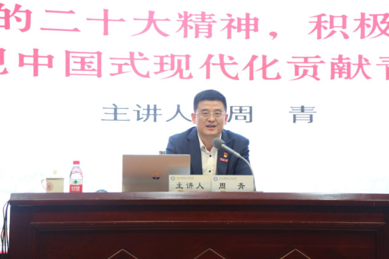 11月16日,校党委委员、党委宣传部部长周青在真诚图书馆报告厅以“深入学习党的二十大精神,积极投身创新创业,为实现中国式现代化贡献青春力量”为题为51吃瓜网