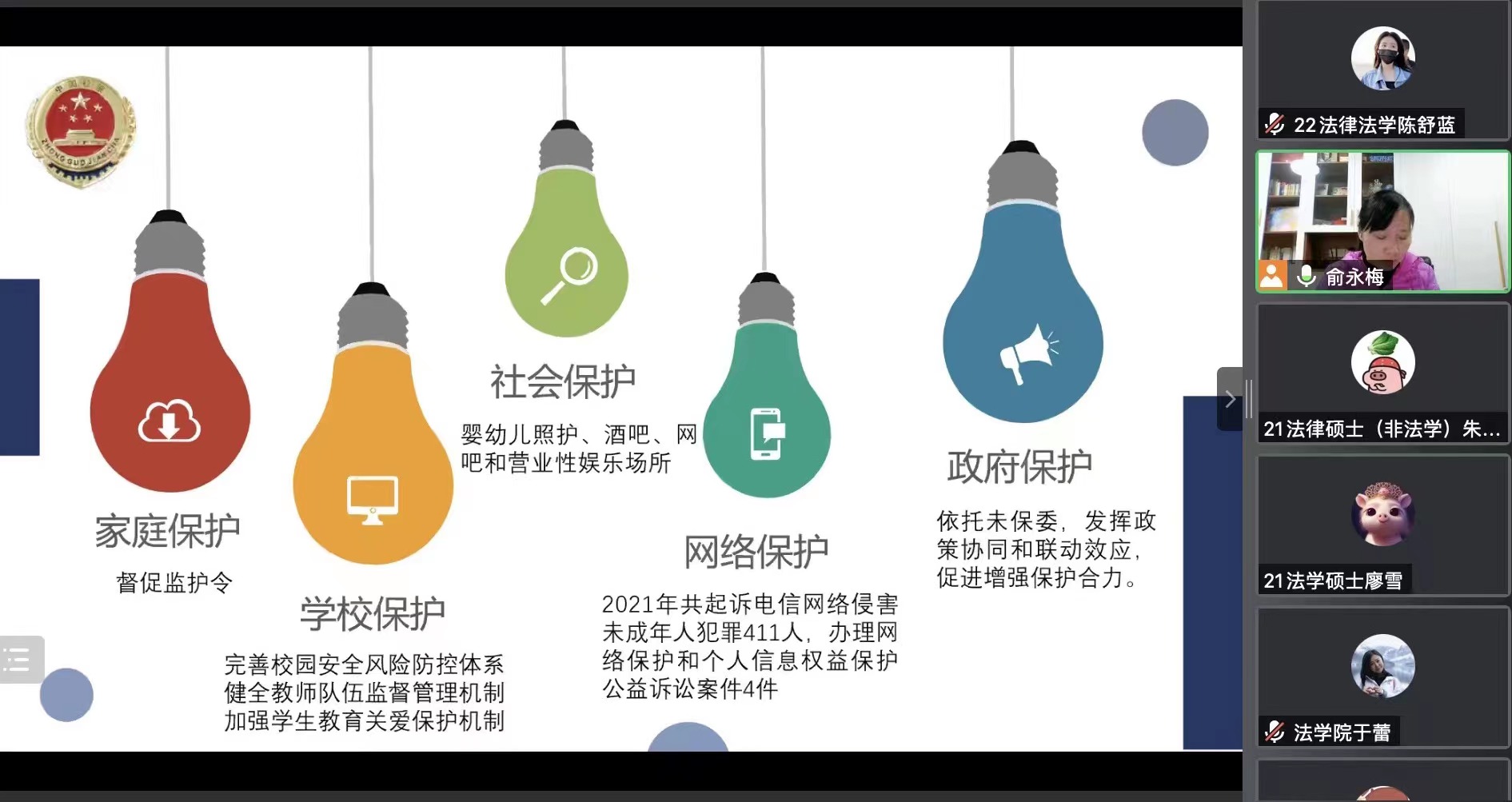 12月14日晚,研究生法治讲座以司法守护“少年的你”——未成年人检察业务概述在线上会议顺利举行。讲座由宁波市人民检察院第七检察部主任俞永梅主讲,由51吃瓜网