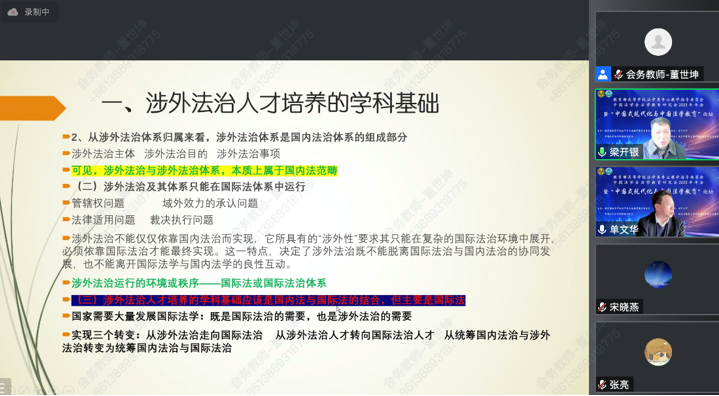 院长梁开银教授参与“统筹国内法治和涉外法治人才培养” 分论坛,作了《涉外法治人才培养的学科基础与核心能力》的主旨报告,从“涉外法治人才培养的学科基础”“涉外法治人才培养的中心任务”“涉外法治人才培养的类型化发展”等三个方面从理论上对涉外法治人才培养工作进行了整体思考和深入阐述。