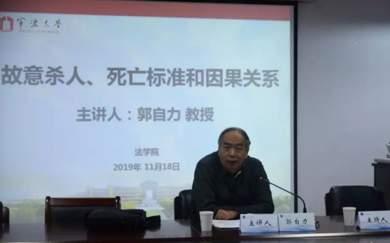 欢迎教授的到来。郭教授首先介绍了本次讲座的主要内容及所涉的相关专业知识,紧接着开始介绍故意杀人罪这一我们熟知的刑法罪名,为我们展现了该罪名的复杂性,还介绍了故意杀人罪中的因果关系问题及死亡标准理论。