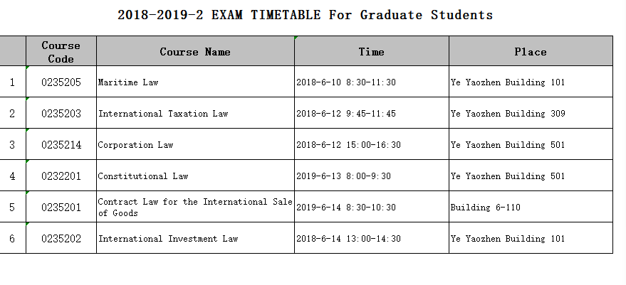 The examination time and place is shown in the table below, please pay attention! The examinations of other courses are arranged by the lecturer, and please confirm with lecturer.