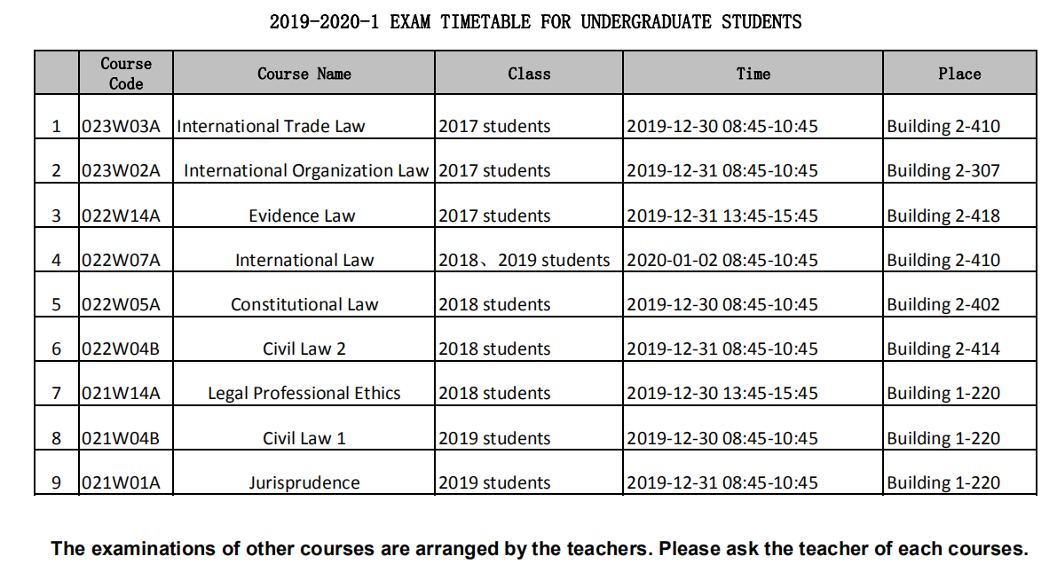 Here is the time table of the unified examinations. The examinations of other courses are arranged by the lecturer, and please confirm the examination time and place with the lecturer.